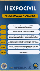 A II ExpoCivil será realizada no dia 15 de outubro de 2025, às 14h, no Auditório Central do Campus Angicos. A programação está repleta de palestras enriquecedoras, proporcionando aos participantes conhecimento técnico e troca de experiências.