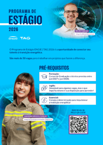 O Programa de Estágio ENGIE | TAG 2026 está oficialmente aberto e busca estudantes de diferentes áreas do conhecimento, incluindo Engenharias, Administração e Negócios, Economia e Contabilidade, Tecnologia e Dados, Direito, Comunicação e Design, além de cursos técnicos correlatos.